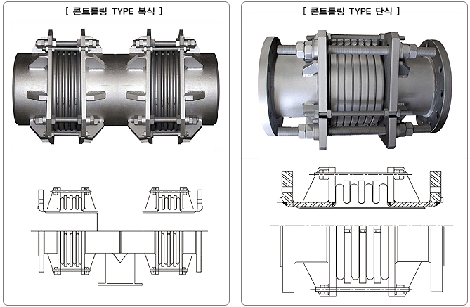- 본 신축관이음은 벨로우즈사이에 링을 삽입하여 신축작용을 균등하게 하여주며 고압용으로 우수한 성능을 가진 특성을 가지고 있으며 스테이볼트와 조정파이프를 설치하여 신축의 한도를 조정하여 주는 것입니다